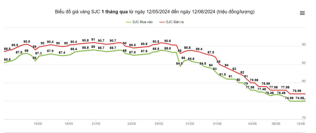 Cập nhật lúc 11h00, Giá vàng SJC neo ở mức 74,98 triệu đồng chiều mua – 76,98 triệu đồng/lượng chiều bán, không thay đổi so với chốt phiên 11/6.