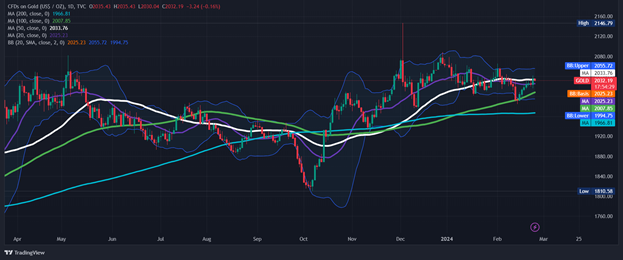 • Ngắn – Trung hạn: Thị trường vàng cũng đã vượt trung bình động 20 ngày ở mức $2025 và đang phản ứng tại trung bình động 50 ngày tại $2033.