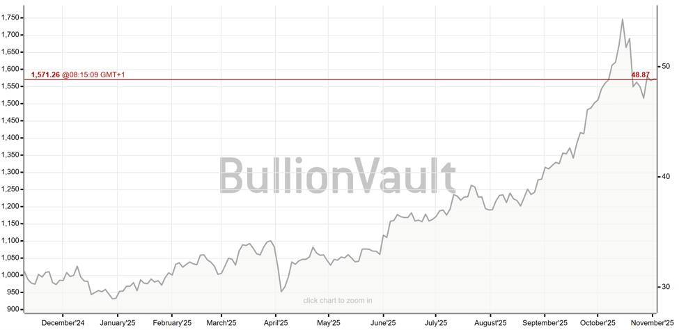 (GVNET) Giá bạc (XAG/USD) đã bật tăng lên 48,66 USD/oz trong phiên giao dịch thứ Hai (3/11), tăng 1,03% so với ngày trước đó, duy trì quanh vùng đỉnh lịch sử tháng 10 ở 53,34 USD/oz. Theo phân tích của CNBC, đà tăng mạnh của vàng đang mở đường cho bạc tăng gấp đôi lên 100 USD/oz nếu kim loại quý này vượt qua ngưỡng tâm lý quan trọng 50 USD.