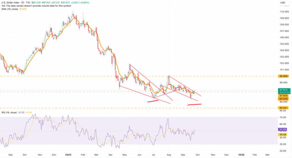 Trong phiên giao dịch thứ Tư, chỉ số USD Index đã bứt phá qua đường xu hướng giảm, đồng thời hình thành mô hình double bottom (hai đáy) tiềm năng, đi kèm với tín hiệu phân kỳ dương trên RSI. Nếu USD vượt ngưỡng 100 điểm, kịch bản tăng giá có thể trở thành “pain trade” cho phần còn lại của năm 2025, khi dòng vốn đổ mạnh vào tài sản an toàn này.