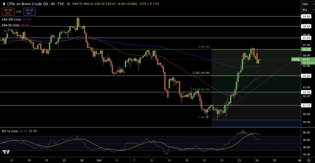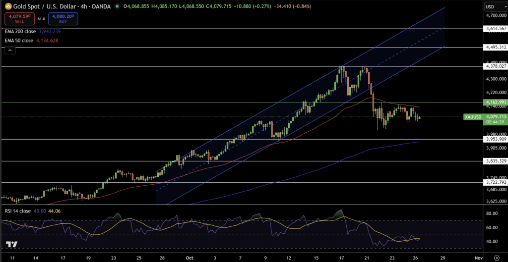 Trên biểu đồ 4 giờ, vàng đang dao động quanh mức 4.080 USD, dưới đường trung bình EMA 50 ngày (4.134 USD), sau khi rút lui từ đỉnh gần 4.378 USD.