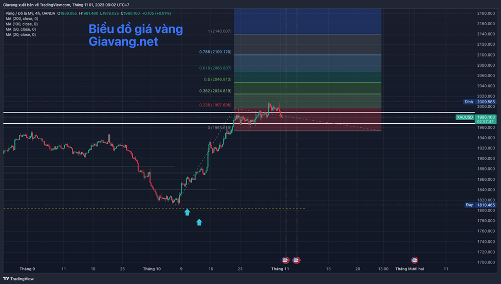 Giá vàng (XAU/USD) bước vào phiên Á sáng 1/11 biến động quanh mức 1.984 USD sau khi không thành công trong việc duy trì mốc 2.000 USD. Nhà đầu tư đang tiếp tục đợi cuộc họp chính sách của Ủy ban Thị trường Mở Liên bang (FOMC) và không kỳ vọng có sự thay đổi nào về lãi suất.