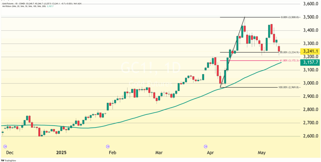 Giá vàng tương lai tháng 6/2025 giảm 2,62% (tương đương 87,30 USD), chốt phiên ở mức 3.241,80 USD/oz, đánh dấu một cú điều chỉnh 50% so với mức đỉnh lịch sử 3.509,90 USD vào ngày 22/04. Các chuyên gia kỹ thuật hiện đang theo dõi hai vùng hỗ trợ quan trọng: 3.176,50 USD (mức thoái lui Fibonacci 61,8%) và 3.157,70 USD (đường trung bình động 50 ngày).