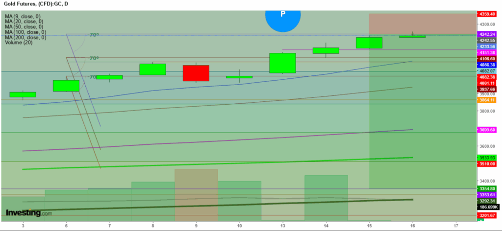 Trên đồ thị ngày, giá Gold Futures đã thử vượt vùng kháng cự quan trọng tại $4.242/oz, đạt đỉnh trong ngày ở $4.254,80, nhưng nhanh chóng bị bán mạnh và lùi về quanh $4.228.