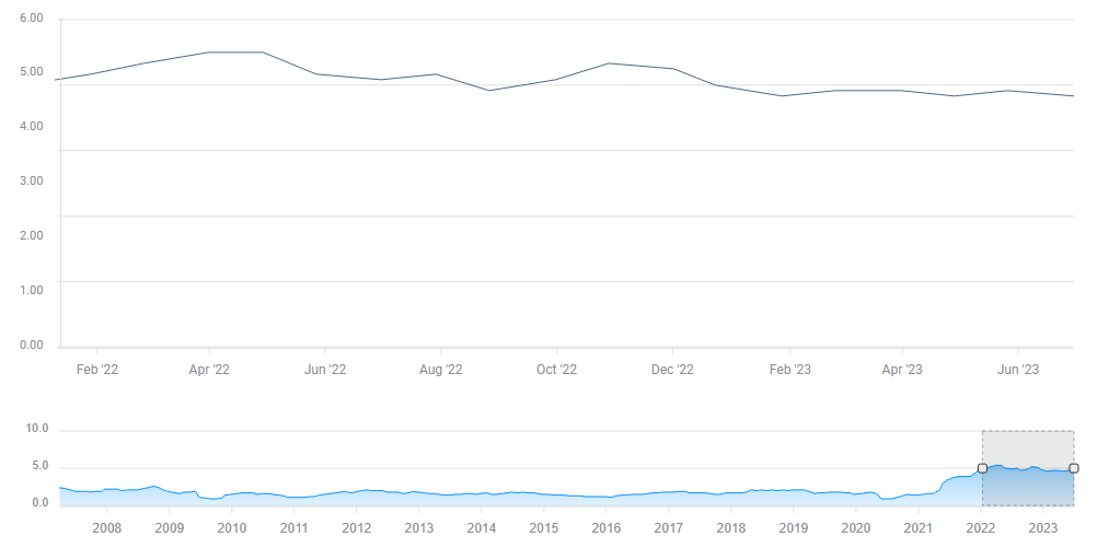Vậy, chỉ số PCE lõi gần đây đã phát triển như thế nào? Chỉ báo này đang giảm dần từ mức cao nhất 5,4% hàng năm xuống 4,6% vào tháng 5/2023 và khả năng sẽ giảm xuống 4,2% vào tháng 6: