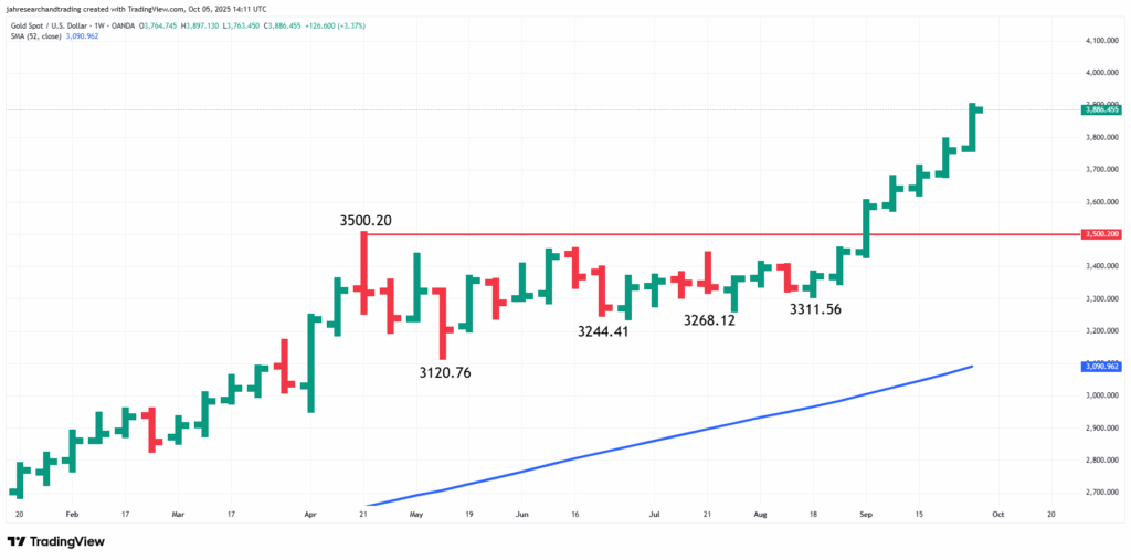 Với việc không còn vùng kháng cự lịch sử, mốc 4.000 USD trở thành mục tiêu tâm lý quan trọng tiếp theo. Tín hiệu cảnh báo duy nhất là nếu giá vàng hình thành mẫu hình đảo chiều trên đồ thị tuần – khi đó, khả năng điều chỉnh ngắn hạn sẽ gia tăng.
