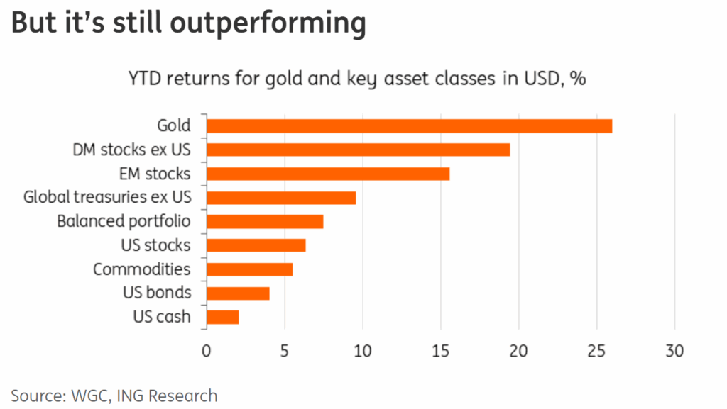 Tuy nhiên, các yếu tố cơ bản hỗ trợ vàng vẫn còn vững chắc, theo bà Ewa Manthey, Chuyên gia Chiến lược Hàng hóa tại ING. Bà nhận định:
