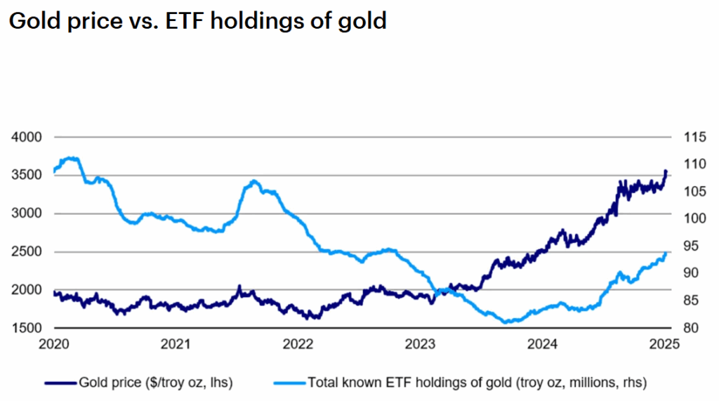 Mặc dù vàng đã tăng hai con số trong 2023 và 2024, nhưng lượng nắm giữ ETF lại sụt giảm. Tuy nhiên, 2025 đang chứng kiến dòng vốn đảo chiều, nếu xu hướng này tiếp diễn, đây sẽ là lực đẩy mạnh cho giá vàng.