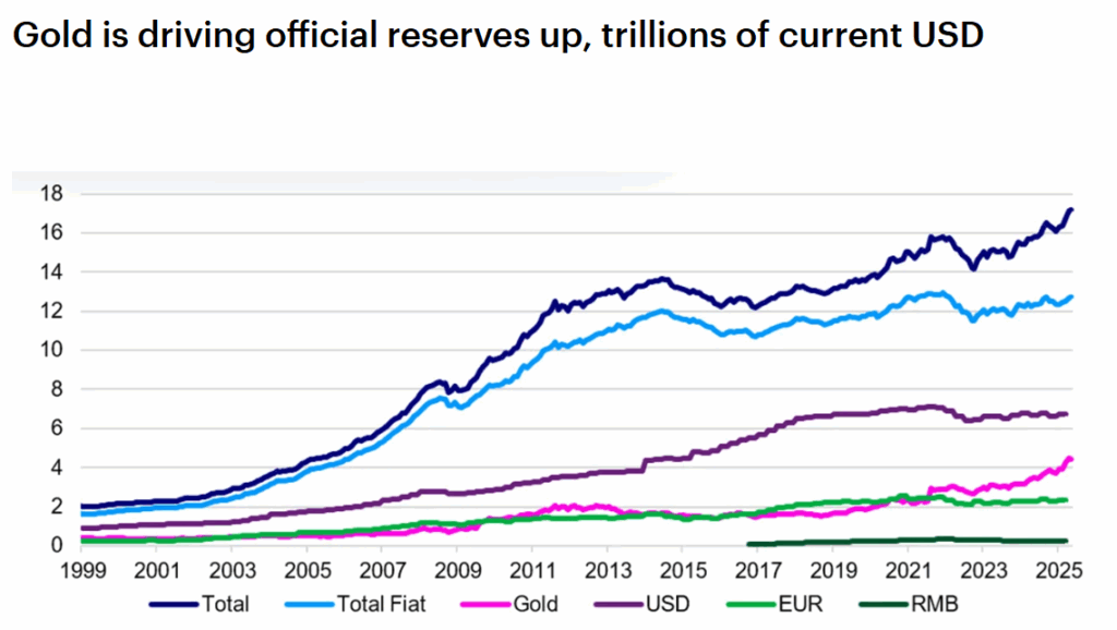 “Chỉ số DXY đi ngang từ giữa năm, trong khi lợi suất trái phiếu kho bạc Mỹ kỳ hạn 30 năm cũng ổn định,” báo cáo nêu. “Động lực chính đến từ ngân hàng trung ương toàn cầu tăng mạnh dự trữ vàng, chuyển dịch khỏi tiền pháp định.”
