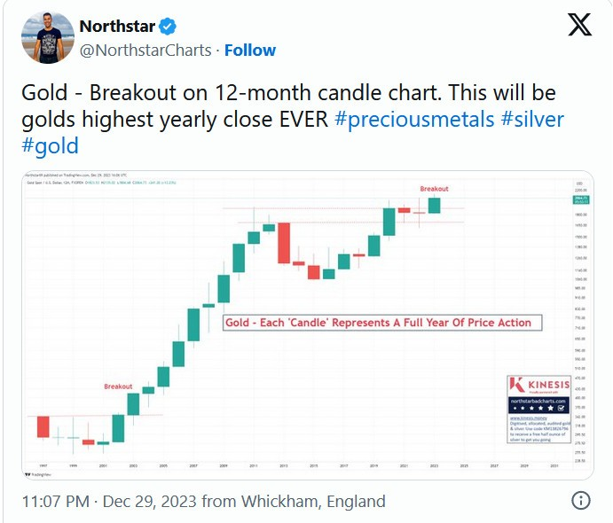 Trong một bài đăng khác, ông chia sẻ biểu đồ hàng năm cho thấy vàng sẽ tăng giá trước năm 2024. “Đây sẽ là mức đóng cửa hàng năm cao nhất từ trước đến nay của vàng,” ông viết.