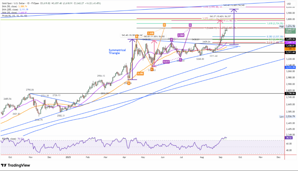 Từ ngày 2/9, vàng đã tăng gần như liên tục, với mức tăng 11% (tương đương 363 USD) chỉ trong 14 phiên, từ đáy 3.311 USD lên đỉnh 3.675 USD. Đà tăng dốc đứng này làm gia tăng khả năng chốt lời và mở ra kịch bản điều chỉnh hoặc tích lũy trước khi xu hướng tăng được nối dài.