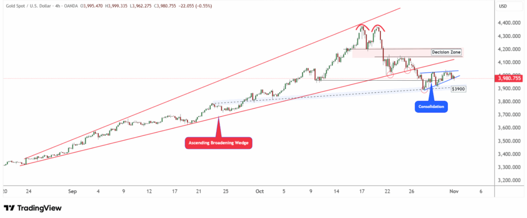 Giá vàng (XAU/USD) đang bước vào giai đoạn tích lũy quanh mốc $4000/oz sau khi Cục Dự trữ Liên bang Mỹ (Fed) cắt giảm lãi suất vào tuần trước. Dù giảm mạnh từ đỉnh kỷ lục $4380, vàng vẫn khép lại tháng 10 với mức tăng 3,74%, khẳng định xu hướng tăng trung hạn chưa bị phá vỡ.