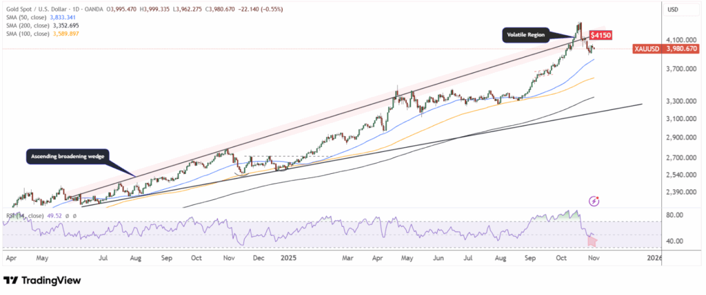 Trên khung daily, giá vàng đã phá vỡ đường kháng cự của mô hình nêm mở rộng tăng dần và hiện đang dao động quanh vùng $4000.