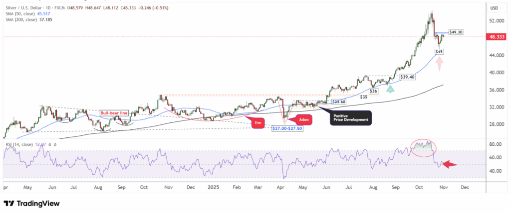 Giá bạc (XAG/USD) đã bật tăng mạnh từ vùng SMA 50 ngày quanh $45, đạt kháng cự $49,30 trước khi chững lại.