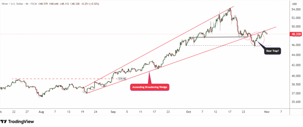 Khung 4 giờ cho thấy bạc đã phá vỡ mô hình nêm mở rộng, nhưng nhanh chóng hồi phục từ vùng $45.