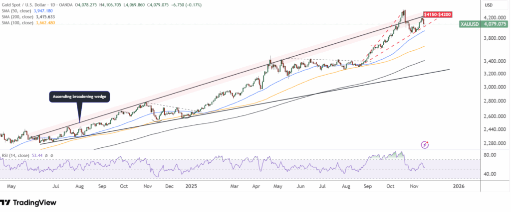 Vàng giảm từ vùng kháng cự 4.250 USD và kiểm định hỗ trợ quanh 4.030 USD vào thứ Sáu, đưa kim loại quý vào nhịp điều chỉnh với thiên hướng giảm nhẹ. Nhà đầu tư đang chờ đợi phát biểu từ các quan chức Fed như John Williams và Neel Kashkari – yếu tố có thể giúp làm rõ định hướng chính sách tiền tệ trong ngắn hạn.