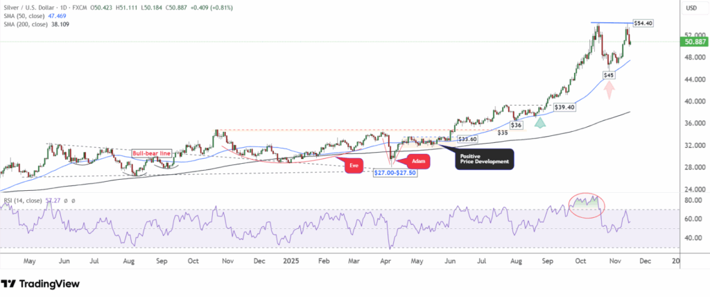 Biểu đồ ngày – Điều chỉnh từ kỷ lục 54.40 USD