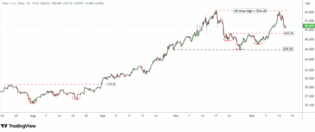 - Chừng nào giá trụ trên 49,30 USD, bạc có thể tích lũy dưới 54,40 USD trước khi bứt phá.