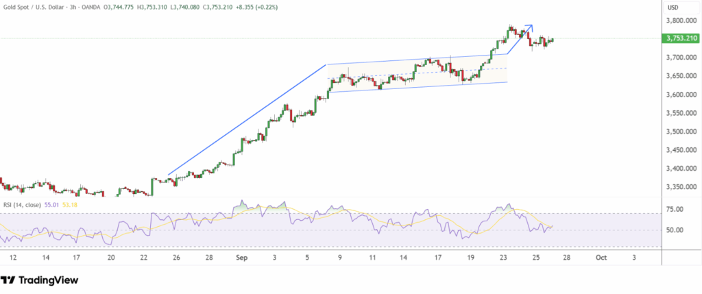 Biểu đồ 4 giờ: Sau khi thoát khỏi kênh tăng, vàng chạm gần 3.800 USD rồi điều chỉnh kỹ thuật. Thị trường hiện trong giai đoạn ổn định, chuẩn bị xác lập hỗ trợ mới để tiếp tục xu hướng đi lên.