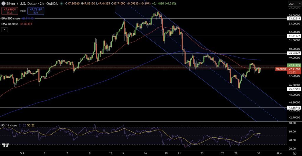 - Giao dịch quanh $47.71/oz, sát đường EMA 50 kỳ tại $47.83.