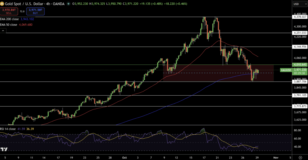 Biểu đồ 4 giờ cho thấy vàng đang tích lũy dưới đường EMA 50 (4.069 USD), trong khi EMA 200 (3.943 USD) đóng vai trò hỗ trợ ngắn hạn.