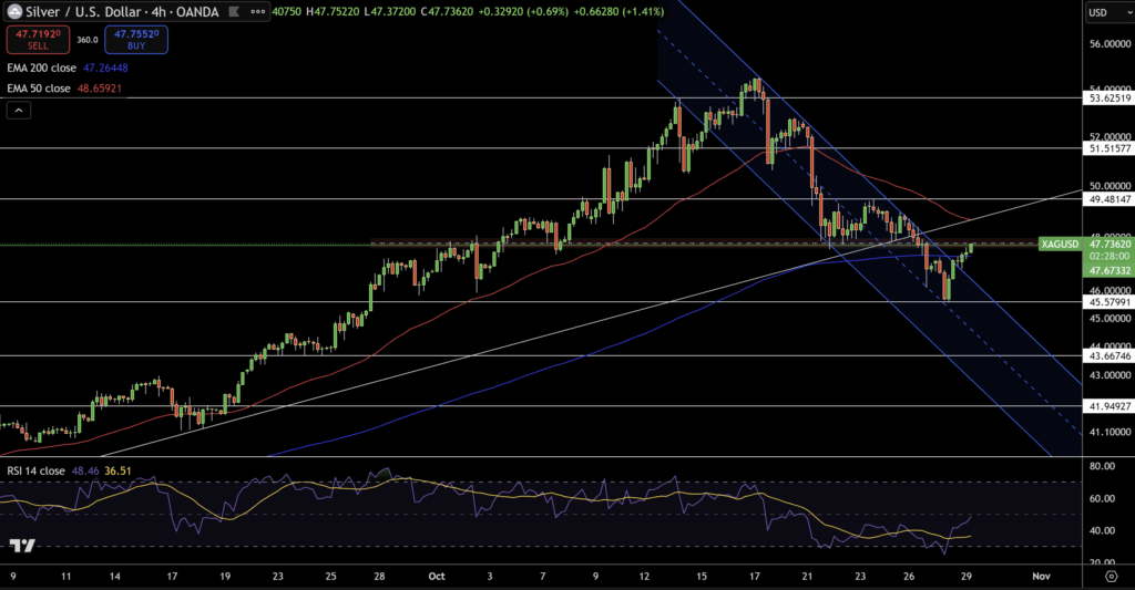 Biểu đồ 4 giờ cho thấy giá đang thử phá vỡ kênh giảm, giao dịch quanh EMA 200 tại 47,26 USD, nhưng vẫn dưới EMA 50 tại 48,65 USD.