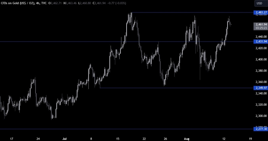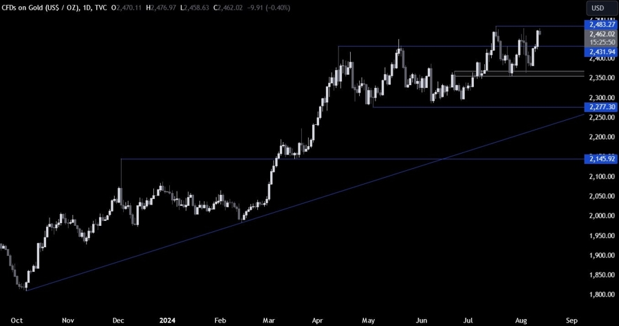 Trên biểu đồ ngày, chúng ta có thể thấy rằng vàng cuối cùng đã tăng trở lại vùng kháng cự quanh mức $2483. Đây là nơi chúng ta có thể mong đợi phe bán sẽ bước vào với rủi ro đẩy giá trở lại mức hỗ trợ $2360. Mặt khác, người mua sẽ muốn thấy giá tăng cao hơn để tăng cược tăng giá lên mức cao nhất mọi thời đại mới.