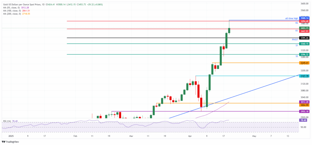 Về mặt kỹ thuật, sau khi phá vỡ mức kháng cự tại $3494, vàng đã chạm đỉnh mới tại $3500, thiết lập vùng kháng cự kép quan trọng. Nếu vàng đóng cửa hàng ngày trên $3447 – mức kháng cự R1 – thì đà tăng hoàn toàn có thể tiếp diễn trong những ngày cuối tháng 4.