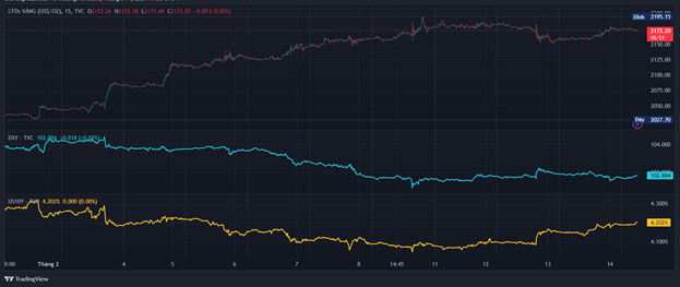Chỉ số DXY – đo lường sức mạnh của đồng bạc xanh so với các đồng tiền chính tăng vượt 103 sau tin lạm phát nhưng lại không thể duy trì động lực mà đảo chiều đi xuống. Sự điều chỉnh của đồng tiền định giá vàng giúp cho kim loại quý có động lực tăng. Chỉ số DXY giờ quanh mốc 102,8 còn Lợi suất Trái phiếu chính phủ Mỹ kì hạn 10 năm ở mức 4,2%.