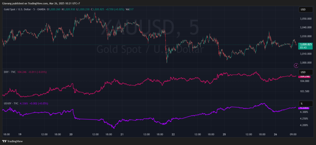 Động lực tăng giá của vàng chững lại cả đồng USD và Lợi suất đều tăng. Chỉ số DXY neo quanh mức 104,247. Lợi suất Trái phiếu chính phủ Mỹ kì hạn 10 năm ở ngưỡng 4,336%.