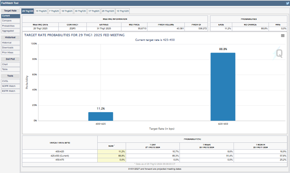Thị trường hiện đang dự đoán 88,8% khả năng Fed sẽ giữ nguyên lãi suất tại cuộc họp vào tháng 1 tới.