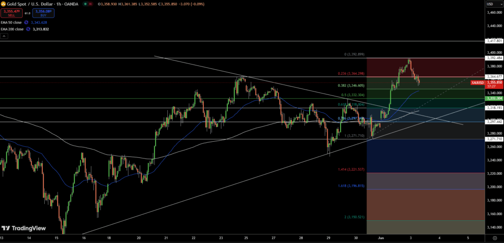 Tuy nhiên, áp lực giảm vẫn bị hạn chế nhờ kỳ vọng Fed sẽ cắt giảm lãi suất trong năm 2025, cùng với lo ngại gián đoạn thương mại toàn cầu. Hiện tại, vùng $3,365 là ngưỡng kháng cự then chốt, nếu bị phá vỡ có thể kích hoạt đà tăng hướng đến vùng $3,392 trở lên. Ngược lại, thất bại tại đây có thể kéo giá về hỗ trợ $3,332 hoặc $3,318 – các mốc Fibonacci quan trọng.