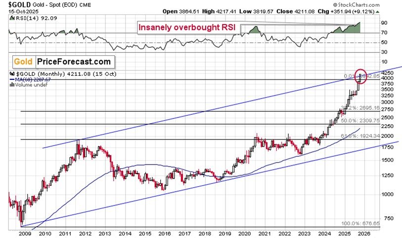 Theo biểu đồ dài hạn, vàng đã đạt – thậm chí vượt nhẹ – mức mở rộng Fibonacci 1.382, tính từ chu kỳ tăng giá 1999 – 2011. Đây là một ngưỡng kháng cự siêu mạnh mà trong lịch sử, giá thường quay đầu giảm sau khi chạm tới.