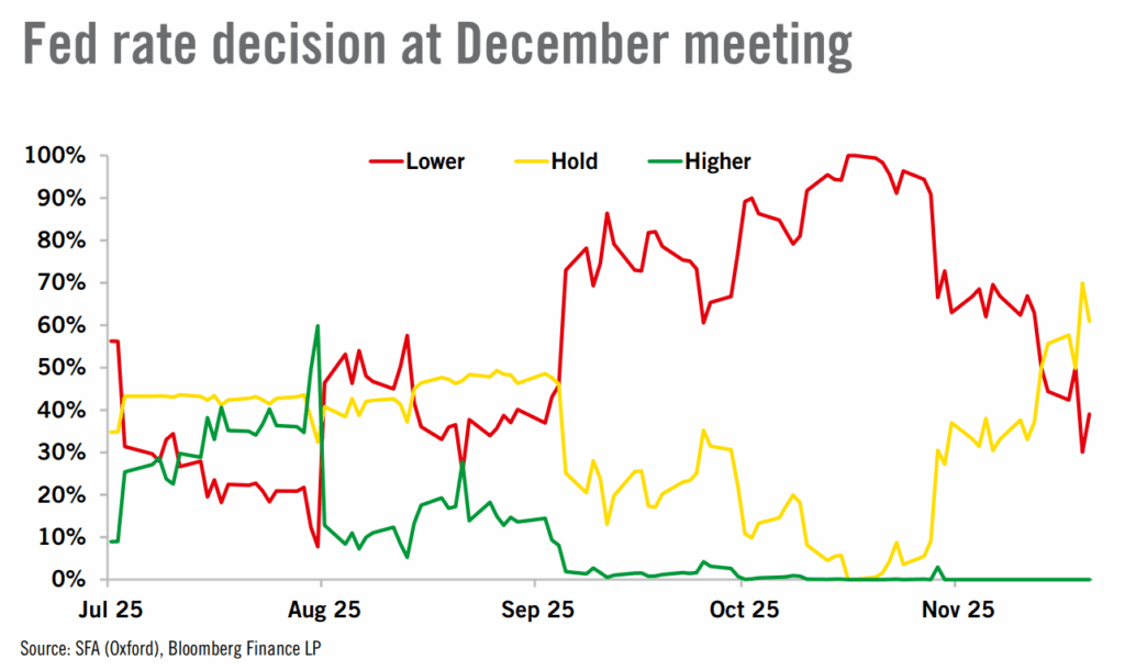 Họ cho biết, sau biên bản cuộc họp gần nhất, xác suất cắt giảm lãi suất đã giảm từ mức 50/50 xuống chỉ còn khoảng 1/3. Biên bản cho thấy FOMC đánh giá tăng trưởng GDP thực kỳ vọng mạnh hơn, trong khi các yếu tố thuế quan có thể gây áp lực lên lạm phát – dấu hiệu cho thấy Fed chưa cần phải nới lỏng chính sách.