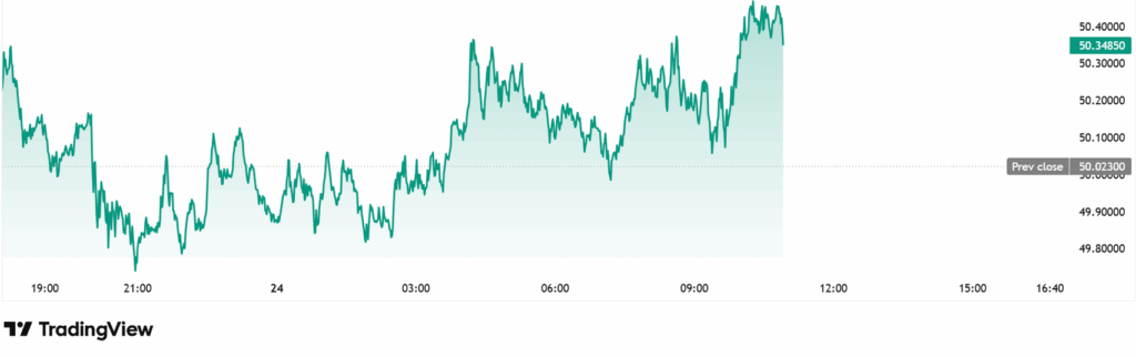 Bạc cũng khởi động tuần mới với đà tăng tốt. Giá bạc giao ngay hiện ở mức 50,348 USD/oz, tăng 0,65% và giao dịch gần vùng trên của biên độ ngày.