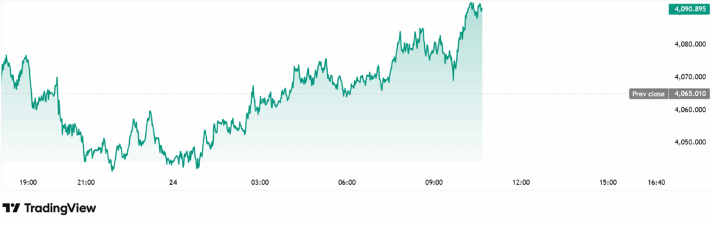 Bước sang phiên đầu tuần, vàng đang hồi phục nhẹ sau khi suy yếu vào cuối tuần trước. Giá vàng giao ngay hiện ở mức 4.091,28 USD/oz, tăng 0,65% và đang tiến gần vùng kháng cự then chốt 4.100 USD/oz.