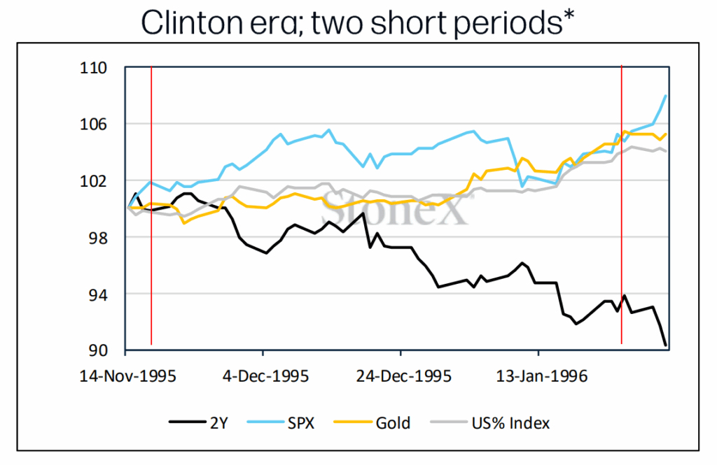 Thời Tổng thống Clinton (1995-1996): Hai lần đóng cửa 5 ngày và 21 ngày. Vàng giảm nhẹ, S&P 500 vượt trội, lợi suất trái phiếu ngắn hạn biến động mạnh.