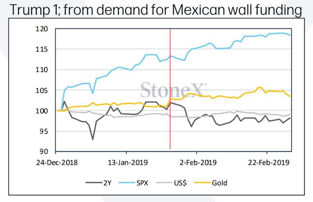 Thời Tổng thống Trump (2018-2019): Đóng cửa kỷ lục 35 ngày liên quan đến yêu cầu chi 5,7 tỷ USD xây dựng bức tường biên giới Mexico. USD và lợi suất trái phiếu giảm, trong khi vàng và S&P 500 đều tăng mạnh, đặc biệt chứng khoán vượt trội so với vàng.