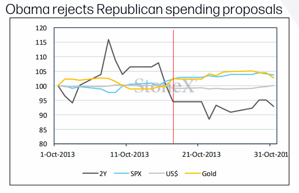Thời Tổng thống Obama (2013): Chính phủ tạm ngưng 16 ngày do bất đồng về Obamacare. Khoảng 800.000 nhân viên bị nghỉ việc, hơn 1 triệu người làm việc không lương. Thị trường nhìn chung phản ứng khá ổn định, vàng và chứng khoán giữ vững, lợi suất 2 năm tăng rồi giảm dần.