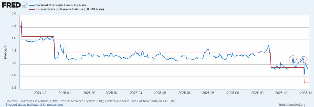 Chỉ số SOFR (Secured Overnight Financing Rate) tiếp tục cao hơn IORB (Interest on Reserve Balances), cho thấy tình trạng thắt chặt nguồn vốn ngắn hạn.