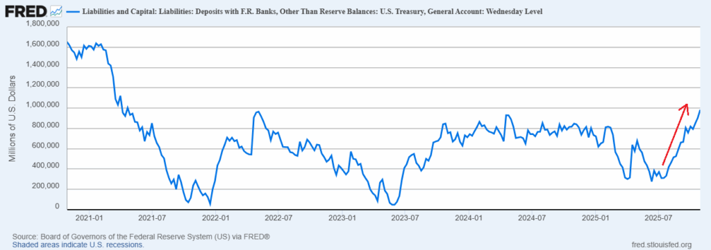 Cùng lúc, Tài khoản chung của Bộ Tài chính Mỹ (U.S. Treasury’s General Account) tăng mạnh do tình trạng chính phủ tạm ngừng hoạt động (shutdown), khiến thanh khoản toàn hệ thống bị rút cạn – tạo lực cản trực tiếp đối với Bitcoin.