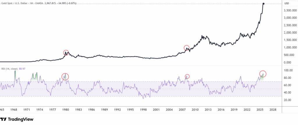Trên đồ thị dài hạn, chỉ báo RSI đạt mức cao nhất kể từ thập niên 1980 – tương tự thời điểm năm 2008 trước khi vàng tăng mạnh lên đỉnh 2011.