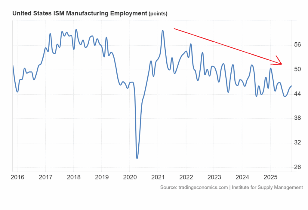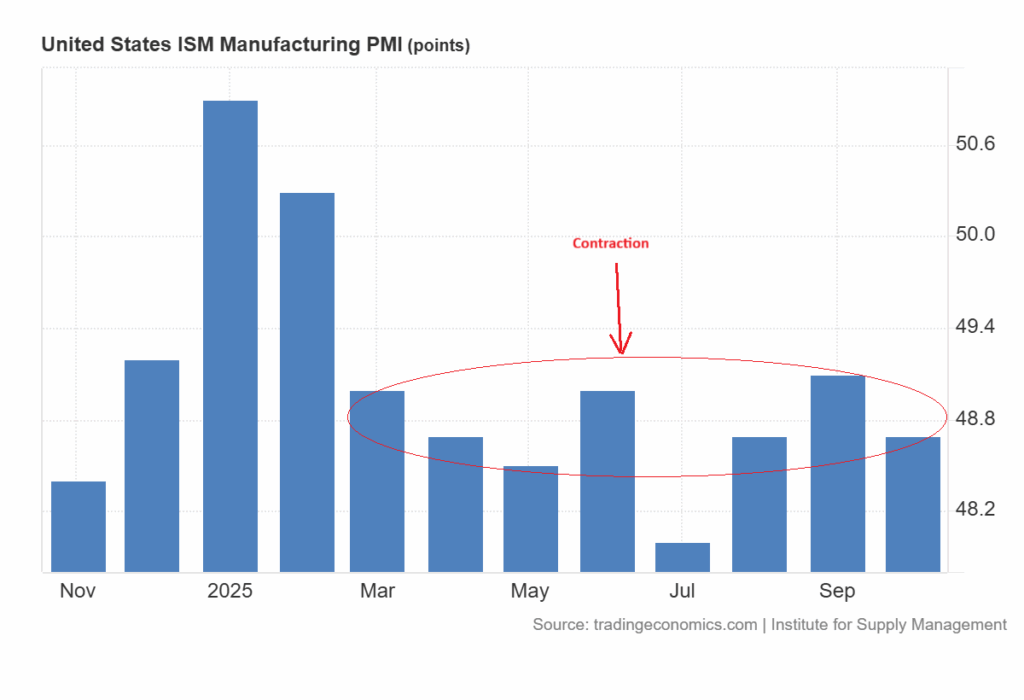 Chỉ số ISM Manufacturing PMI đã suy giảm 8 tháng liên tiếp, phản ánh sự yếu kém bền vững trong hoạt động sản xuất.