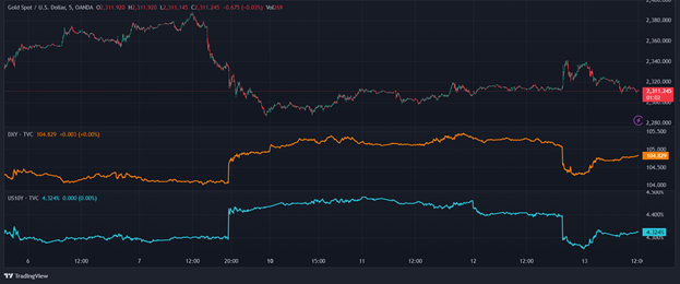 Trong khi đó, Chỉ số DXY hồi phục lên mốc 104,8 và Lợi suất Trái phiếu chính phủ Mỹ kì hạn 10 năm neo quanh mốc 4,324%.
