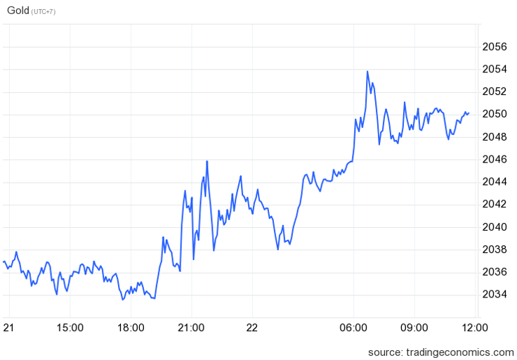 - Vàng (XAU/USD) đạt đỉnh gần ba tuần, ở mức khoảng $2.055 trong phiên giao dịch châu Á 22/12.