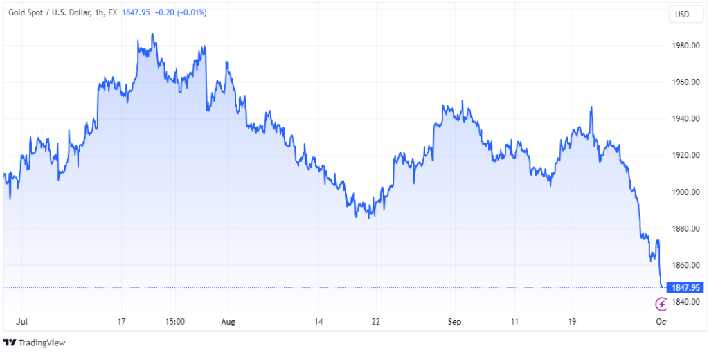 Giá vàng thế giới chốt tuần cuối cùng của tháng 9, đồng thời cũng là mức giá chốt của quý III/2023 – tại ngưỡng 1.850 USD/ounce – thấp nhất 6 tháng qua. Với mức giá hiện tại, vàng thế giới giảm khoảng 4% trong tuần này, giảm 4,6% trong tháng 9 và 3,5% trong quý III. Quy đổi theo tỷ giá trên thị trường tự do (24.450 VND/USD) giá vàng đứng tại 55,1 triệu đồng/lượng (đã bao gồm thuế, phí).