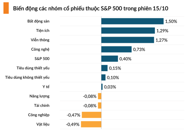 Bảng điện tử S&P 500 ghi nhận đà tăng của 7/11 nhóm ngành. Cổ phiếu Bất động sản và Tiện ích diễn biến tích cực nhất.