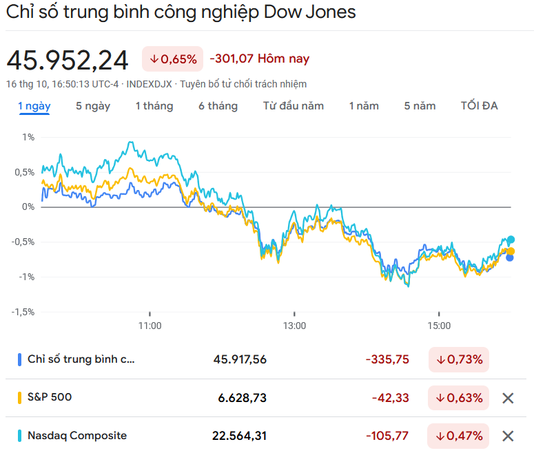 Đóng cửa phiên giao dịch thứ Năm ngày 16/10, chỉ số Dow Jones rớt 301,07 điểm (tương đương gần 0,7%) xuống 45.952,24 điểm. Đầu phiên, chỉ số này đã tăng 170 điểm.