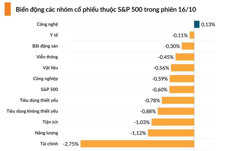 Bảng điện tử S&P 500 ghi nhận sắc đỏ lan tỏa khắp 10/11 nhóm ngành với Tài chính là bị bán mạnh nhất, sau đó là cổ phiếu Năng lượng giảm theo giá dầu.