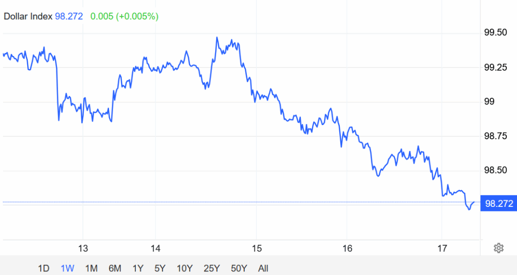 Chỉ số đô la Mỹ DXY giảm xuống còn 98,5 vào ngày thứ Năm, đánh dấu phiên giảm thứ ba liên tiếp khi căng thẳng thương mại Mỹ – Trung leo thang, tình trạng chính phủ Mỹ đóng cửa kéo dài, cùng với kỳ vọng về việc Cục Dự trữ Liên bang (Fed) sẽ tiếp tục cắt giảm lãi suất đã gây sức ép lên đồng bạc xanh.